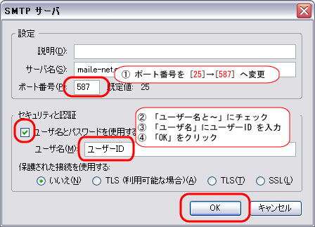 2008年4月1日よりポート25番でのメール送信のブロックを開始いたします。 以降、ポート25番を使用したメールの送信ができなくなりますので、誠にお手数ですが、メールの設定の変更をお願いいたします。